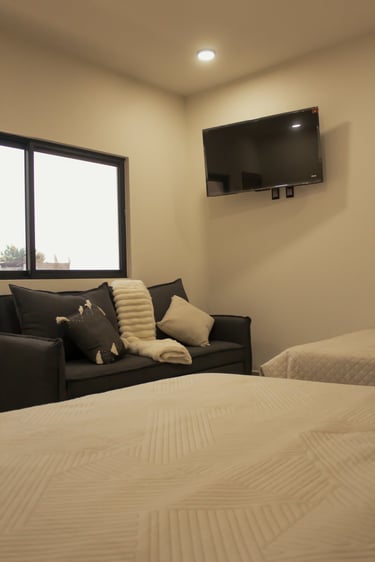 ambas habitaciones cuentan con una cama matrimonial, una cama queen size, un sofa cama, aire acondicionado, lámpara de noche, tv y un amplio baño completo